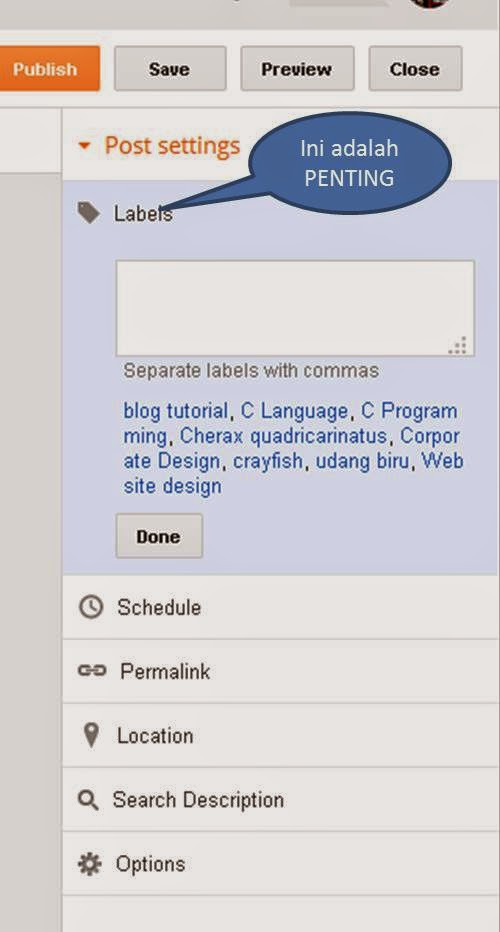Apakah kegunaan labels ini? Labels ini digunakan untuk meletakkan artikel anda dalam kumpulan tertentu. Lazimnya pembaca blog akan mencari artikel yang sama dalam kumpulannya..