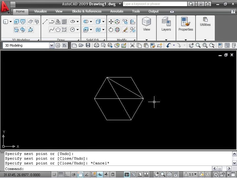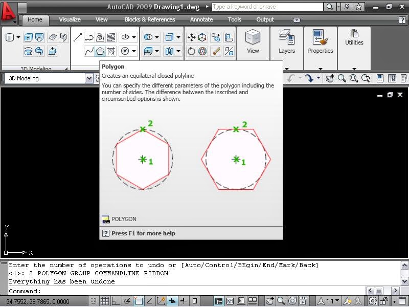 3. Lukiskan satu bulatan kecil di tengah-tengah poligon tadi, diameter 2 (radius 1) dan buang garisan lurus tadi